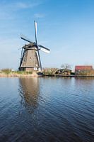 Historische rietgedekte poldermolen bij het Nederlandse dorp Kinderdijk, provincie Zuid-Holland. Het is een zonnige lentedag met een blauwe hemel. De molen wordt in het water van de boezem gereflecteerd.