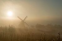 Molen in de ochtendnevel bij zonsopkomst
