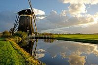 Een van de molens van de molendriegang bij Leidschendam staat in de laatste zonnestralen. Deze molens staan in de polder van Stompwijk in Zuid Holland. Ze staan nog steeds vrij maar de bebouwing van groot Den Haag rukt gestaag op en het is maar de vraag of dit zo blijft. Ik vond de weerspiegeling van de dramatische lucht gelijk een eyecatcher.