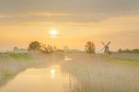 Morgenstemming met een opkomende zon bij poldermolen. De zon weerspiegelt in het water van een beek. De wereld krijgt een licht geel gouden gloed. Het licht schijnt zacht over de rietkragen.