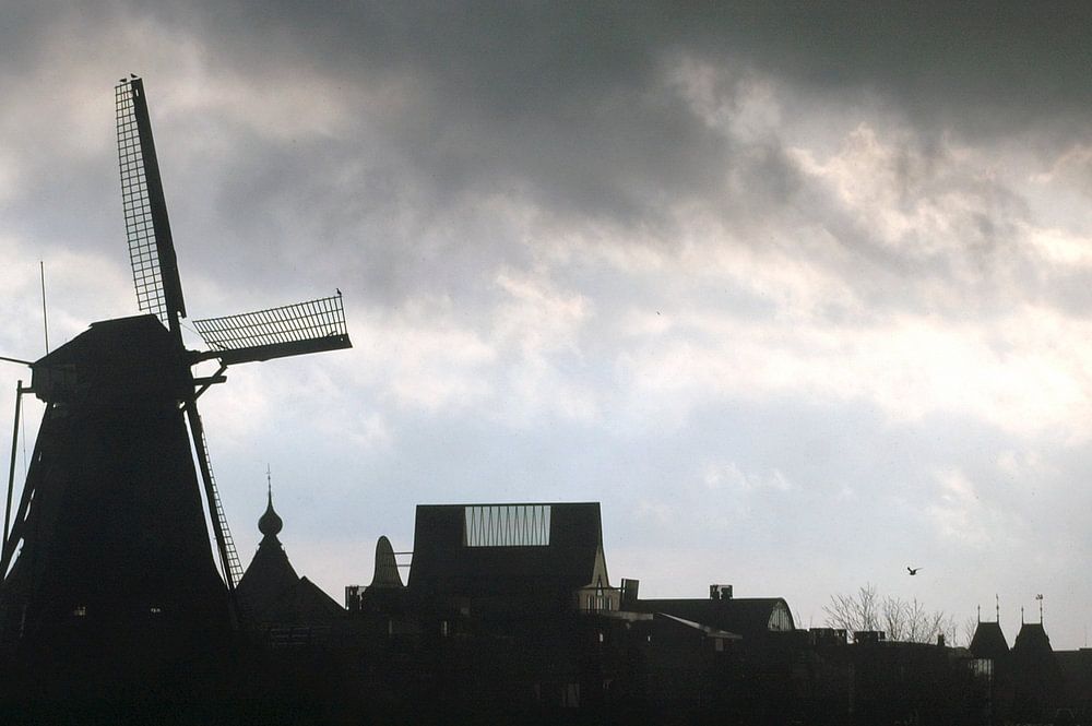Amsterdam The Netherlands Silhouette of windmill "De Gooyer" on the Funenkade.