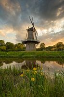 Foto van een molen met een prachtige wolken lucht op de achtergrond. De molen weerspiegelt in het water. Op de voorgrond gele bloemen.