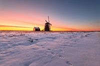 Koop de foto Molen de Koker in de sneeuw tijdens zonsopkomst van Pieter Struiksma op canvas, aluminium dibond, (ingelijste) fotoprint, behang en ArtFrame, op maat geprint in Fine-Art kwaliteit.