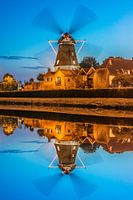 Molen, de Valk Montfoort tijdens blue hour. De verlichting op de huizen, de prachtige blauwe lucht, de beweging in de wieken en de reflectie maken dit een bijzonder beeld.
