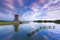 Poldermolen De Helper gelegen aan het Paterswoldsemeer op de grens van de provincies Drenthe en Groningen. De molen wordt verlicht door het licht van de ondergaande zon.