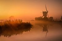 Kinderdijk bij ochtendgloren met mooie zonsopgang en prachtige molens in de mist