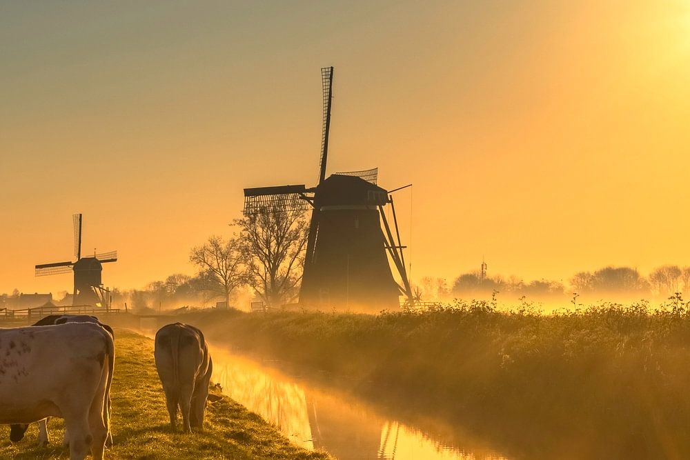 De Achtkante Molen in het dorp Streefkerk, in de Nederlandse gemeente Molenlanden, De molens op de achtergrond met de mist en op de voorgrond een paar koeien. Hollandser kan het niet worden