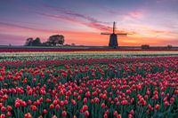 Een fraaie zonsopkomst boven het tulpenveld bij een molen.