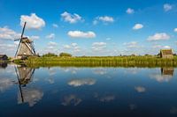 Molen in Kinderdijk met weerspiegeling in het water op een schitterende dag met blauwe lucht en een paar wolken.