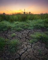 Een molen in de mist tijdens zonsopkomst in het voorjaar. Een droge periode zorgde voor een bijzondere voorgrond met scheuren in de modder.
