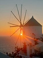 Molen bij zonsondergang op het eiland Santorini, Griekenland