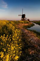 Een opname van het met koolzaad bezaaide dijkje bij de Middelmolen in avondlicht.