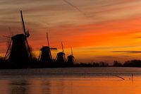 De molengang van Kinderdijk (Zuid-Holland, Nederland) tijdens de zonsopkomst. De lucht kleurde schitterend wat versterkt is door de telelens.