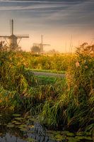 Molens Kinderdijk tijdens het ochtendgloren. Doorkijkje tussen het hoge riet, zijn de molens zichtbaar in de polder van de Alblasserwaard.