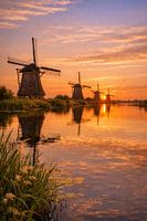 Dit kunstwerk toont het betoverende Hollands landschap van Kinderdijk met meerdere traditionele windmolens die langs een rustige waterweg staan. De windmolens weerspiegelen prachtig in het stille water, waardoor een bijna spiegelachtige compositie ontstaat. De lucht is gevuld met warme tinten oranje, roze en paars, afkomstig van de…