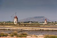 Molens bij de zoutpannen (waterbassins waarbij het water verdampt en het zout achterblijft) in Marsala, Sicilië.