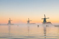 Dit serene beeld van de Zaanse Schans, vastgelegd bij zonsopgang, vangt de rust van een stille ochtend in Nederland. De molens steken majestueus op uit een laaghangende nevel terwijl het zachte, warme licht van de opkomende zon het landschap kleurt in pasteltinten. De spiegeling op het kalme water voegt een dromerige sfeer toe aan de foto, waardoor het lijkt alsof de tijd even stil blijft staan. Het gebruik van een lange sluitertijd zorgt voor een zachte uitstraling die perfect de stilte en vredigheid van dit iconische Nederlandse landschap benadrukt.