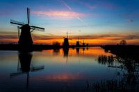 Kinderdijk, zonsopgang met spiegeling in het water. De opkomende zon geeft een rode gloed op de achtergrond. Blauwe lucht met witte bewolking op de achtergrond. Typisch Hollands landschap met een rij molens en water.