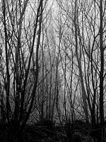 Zicht op molen door mist en kale winterhaag. IJskoude mistige winterdag bij Haarlemmerliede. Takkenbossen en mist verstoppen de molen bijna totaal. Landschap veranderd in lagen.