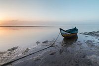 Een moliceiro is een traditionele Portugese platbodem. Ze worden met name gebruikt voor het oogsten van zeewier en de visserij. De foto is gemaakt aan de Ria de Aveiro, een groot binnenmeer in het westen van Portugal. Omdat het in verbinding staat met de zee (Atlantische Oceaan) is er sprake van getijdenwerking. Deze foto is gemaakt op een windstille ochtend bij eb rond zonsopkomst.