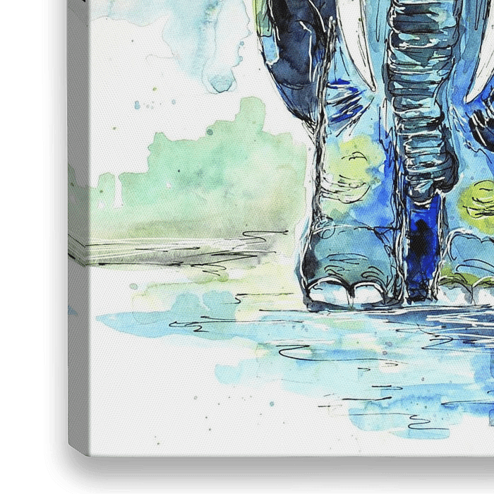 een traditionele aquarelillustratie van een mollig olifantje in surrealistische blauwe kleuren.