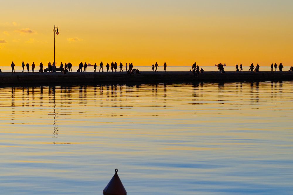 De foto toont de Molo Audace in Triëst bij zonsondergang. De lucht baadt in warme tinten van diep oranje, goud en roze terwijl de zon langzaam achter de horizon verdwijnt. De pier strekt zich recht uit in zee, geflankeerd door kalm, zacht glinsterend water dat het licht van de zonsondergang weerspiegelt. Op de pier zelf zijn silhouetten te zien van mensen die genieten van het uitzicht of een langzame wandeling maken. Aan de horizon smelten de zee en de lucht samen in een zachte lijn, wat een vredige en romantische sfeer creëert.