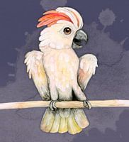 Een aquarel tekening van een schattige Molukkenkaketoe. Hij zit opgewonden op een stok en houdt zijn vleugels wijd zijn snavel staat open, hij maakt veel kabaal.