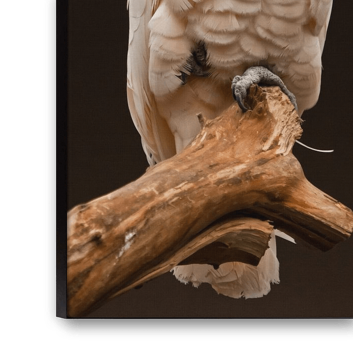 De Molukse kaketoe zit op een tak, een vette en slimme lichtroze vogel op een donkere achtergrond op een tak.