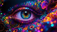 Het schilderij toont een oog op groot formaat als het centrale picturale element, ingebed in een prachtig veld van stralende, heldere kleuren en rijke artistieke texturen, ideaal als expressieve achtergrondafbeelding. De iris ontvouwt zich als een caleidoscoop: concentrische ringen van lichtgevend cyaan, magenta, saffraan en smaragd…