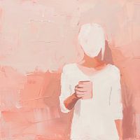 Dame in zachte pastelroze tinten, waarbij het gezicht en de details minimalistisch en anoniem zijn weergegeven. De persoon houdt een mok vast, wat een eenvoudig en alledaags moment van rust en reflectie suggereert. Door het gebruik van lichte en warme tinten, vooral zachtroze en perzikkleurige schakeringen, straalt het werk een gevoel van sereniteit en eenvoud uit. De achtergrond lijkt te bestaan uit ruwe penseelstreken, die het beeld een abstracte, bijna dromerige sfeer geven.