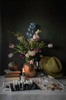 Een levendig maar verstild tafereel waarin natuur, spel en reflectie samenkomen. In het midden staat een bloemrijk boeket in een robuuste aardewerken vaas, als symbool voor lichtheid en vergankelijkheid. Er omheen liggen alledaagse voorwerpen met een verhaal: een hoed, glazen wijn, een schaakspel en een stapel boeken. De compositie…