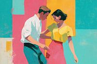 Joyful Moments on the Dance Floor - Dit is een schilderij van een vrouw en man die aan het dansen zijn, met heldere, moderne kleuren zoals geel, roze en turquoise, wat de energieke sfeer van het moment benadrukt.