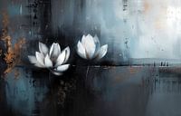 Abstract minimalisme met twee witte lotusbloemen op een grijs blauwe achtergrond met goud accenten en een verweerde grunge textuur.