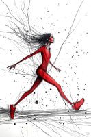 Momentum in Beweging vangt de essentie van energie, snelheid en vastberadenheid. De illustratie toont een jonge vrouw in een levendig rode outfit, die met gerichte intensiteit rent. Haar haar en lichaam worden geanimeerd met dynamische lijnen, die een krachtige stroom van beweging suggereren, wat scherp afsteekt tegen de minimalistische…