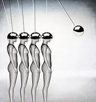 Surrealistische interpretatie van Newton's Cradle over de hedendaagse maatschappij