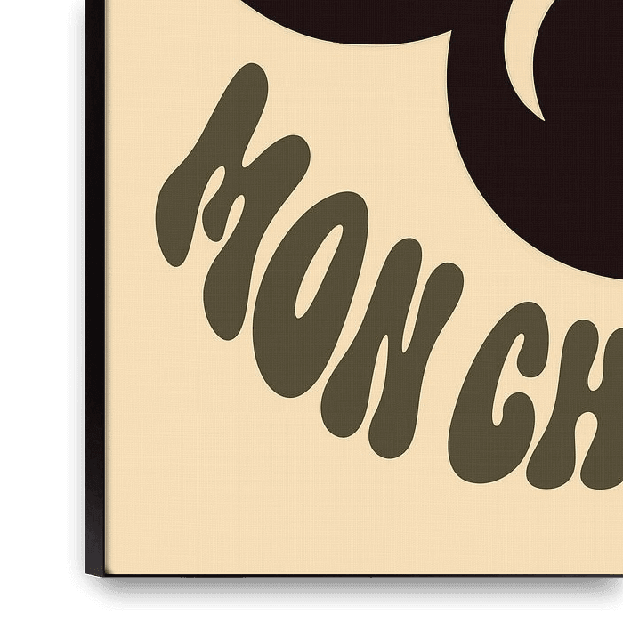 Een stijlvolle kunstdruk van twee zwarte kersen en de tekst "Mon Chéri". De stijl is simplistisch en retro/vintage.