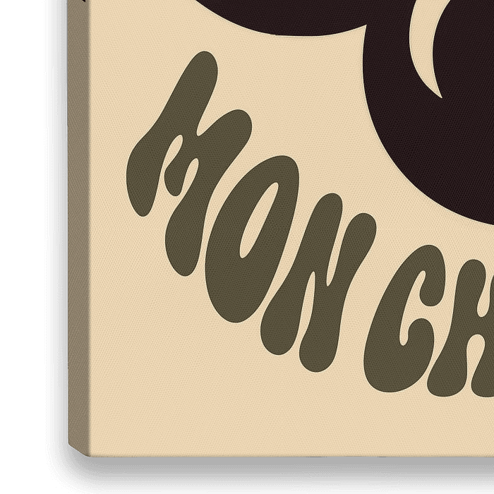 Een stijlvolle kunstdruk van twee zwarte kersen en de tekst "Mon Chéri". De stijl is simplistisch en retro/vintage.