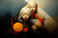 De surrealistische omgeving waarin deze jonge vrouwen zich bevinden, met zijn geometrische figuren en ongewone perspectieven, voegt een extra dimensie toe aan het traditionele olieverfschilderij. Het lijkt bijna alsof ze zweven temidden van een abstracte droom, waar realiteit en fantasie naadloos samenkomen. De geometrische vormen creëren een intrigerend contrast met de organische schoonheid van de vrouwen, waardoor een visuele dialoog ontstaat tussen orde en chaos, traditie en vernieuwing.