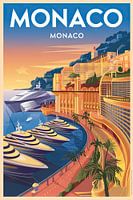 Een betoverend netwerk van glinsterende jachten en majestueuze kliffen ontvouwt zich tegen een avondlijke achtergrond die gloeit in warme oranje tinten. De elegante gebouwen lijken de kust te omarmen, terwijl palmbomen zachtjes wuiven in de wind. Monaco schittert hier in stedelijke pracht en mediterrane flair - een droombestemming voor luxeliefhebbers en avonturiers.
