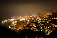 Monaco gezien vanaf de snelweg. Een nachtelijk uitzicht over de stad, het paleis en de haven voor luxe jachten.