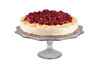 Overheerlijke taart van monchou, slagroom, kersen en geschaafde amandelen op een glazen plateau