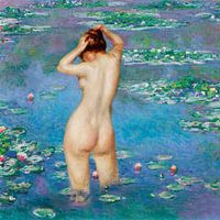 Nieuwe meesters. Bewerking van een waterlelie schilderij van Monet en een schilderij van Renoir met baadster. Klassiek schilderij met een naakte vrouw badend in een meer met waterlelies.