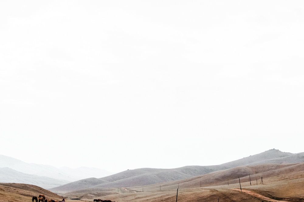 Een kudde geiten en paarden die door de lege heuvels van Mongolië trekken voor eten. De enige tekenen van leven zijn de weg en de elektriciteitspalen in het verder lege landschap.