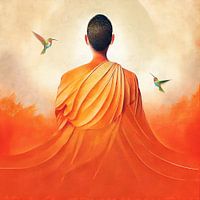 Kleurrijk fantasie schilderij met een monnik en kolibrie vogeltjes in voornamelijk oranje tint.