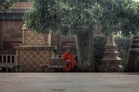 Deze monnik in Siem Reap zit rustig in een boek te bladeren op de binnenplaats van een tempel.