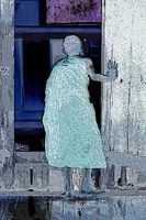 Grafisch weergegeven beeld van een monnik die door het venster vanuit het monumentale teak houten Shwe Yaunghwe Kyaung klooster op straat kijkt.