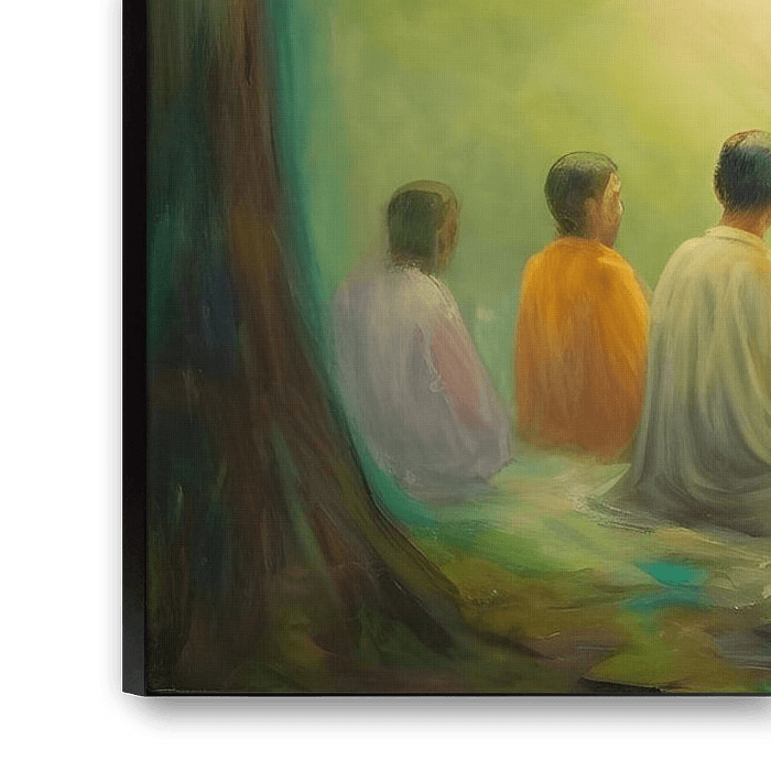 Een impressie van monniken onder de Bodhi boom. Geïnspireerd door de stijl van Pierre-August Renoir. Geschikt voor ruimtes met spiritueel en aardse thema's.