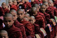 Koop de foto Monniken wachtend in de rij bij een klooster in Myanmar van Gert-Jan Siesling op canvas, aluminium dibond, (ingelijste) fotoprint, behang en ArtFrame, op maat geprint in Fine-Art kwaliteit.