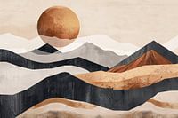 Dit artistieke werk ademt de essentie van rust en sereniteit uit door zijn abstracte weergave van bergen en een ondergaande zon. De harmonie tussen de warme beige en bruine tinten van het berglandschap, samen met de monochrome zwart-wit golvingen, brengt een moderne twist aan de klassieke natuurtafereel. De subtiele overgangen en de strakke geometrische vormen maken dit ontwerp een prachtige toevoeging aan elk interieur dat streeft naar een minimalistische, doch warme uitstraling. Het past perfect in een eigentijdse woonkamer of een stijlvol kantoor, waar het een bron van dagelijkse inspiratie kan zijn. De zon, geschilderd in een diepe roestkleur, biedt een vleugje kleur die de aandacht trekt en zorgt voor een centraal focuspunt. Het geheel vormt een uitnodiging tot contemplatie en innerlijke rust.