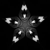 Dit strakke, grafische en abstracte kunstwerk is opgebouwd in een zwart-wit caleidoscopisch patroon dat de vorm van een perfecte, vijfpuntige ster aanneemt. De compositie combineert zachte, vloeiende donkere vormen met scherpe, geometrische witte accenten, wat zorgt voor een krachtig visueel contrast. Tegen de diepzwarte achtergrond wordt de symmetrie en de perfecte balans van het ontwerp benadrukt, waardoor de vorm bijna uit het duister lijkt te treden.